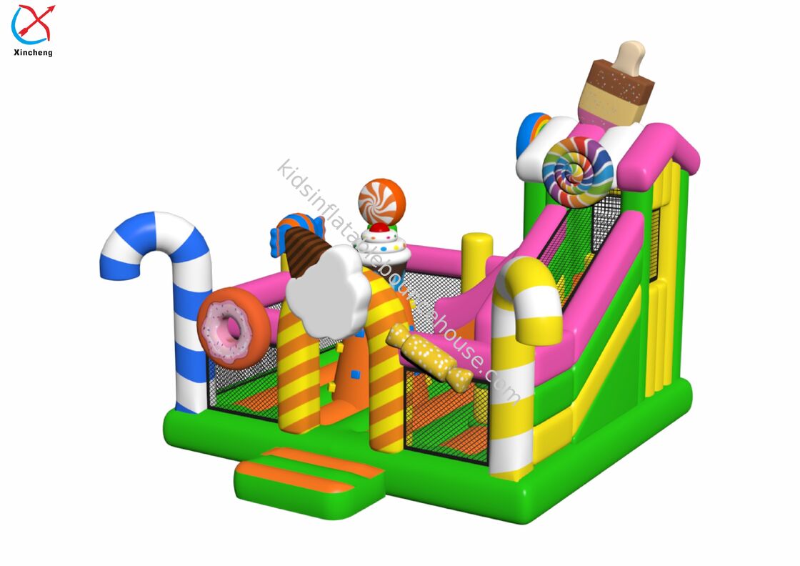 Nadmuchiwany dmuchany zamek klasy komercyjnej z żywym motywem cukierków i zintegrowaną zjeżdżalnią zapewniającą lepszą zabawę i rozrywkę.