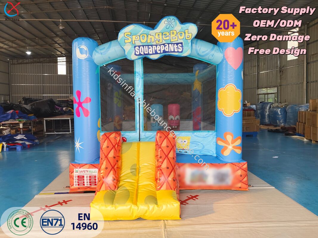 Ten nadmuchany domek z motywem Bob'a Gąbki ma żywe rysunki kreskówek i przymocowany slajd, ożywiając podwodny świat Bikini Bottom dla rozrywki dzieci.